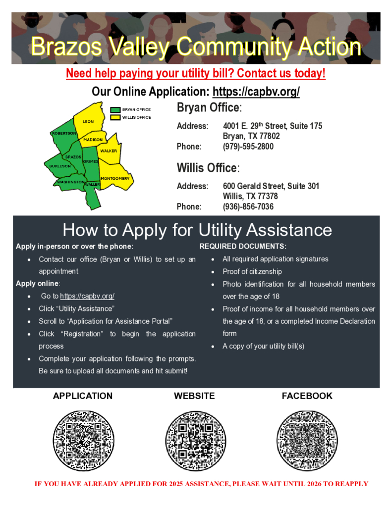 Brazos Valley Community Action Programs (BVCAP) is dedicated to assisting individuals, families, and communities in achieving their full potential. Through initiatives in education, health, and social services, BVCAP strives to enhance the economic, educational, wellness, cultural, and social well-being of the communities we serve.