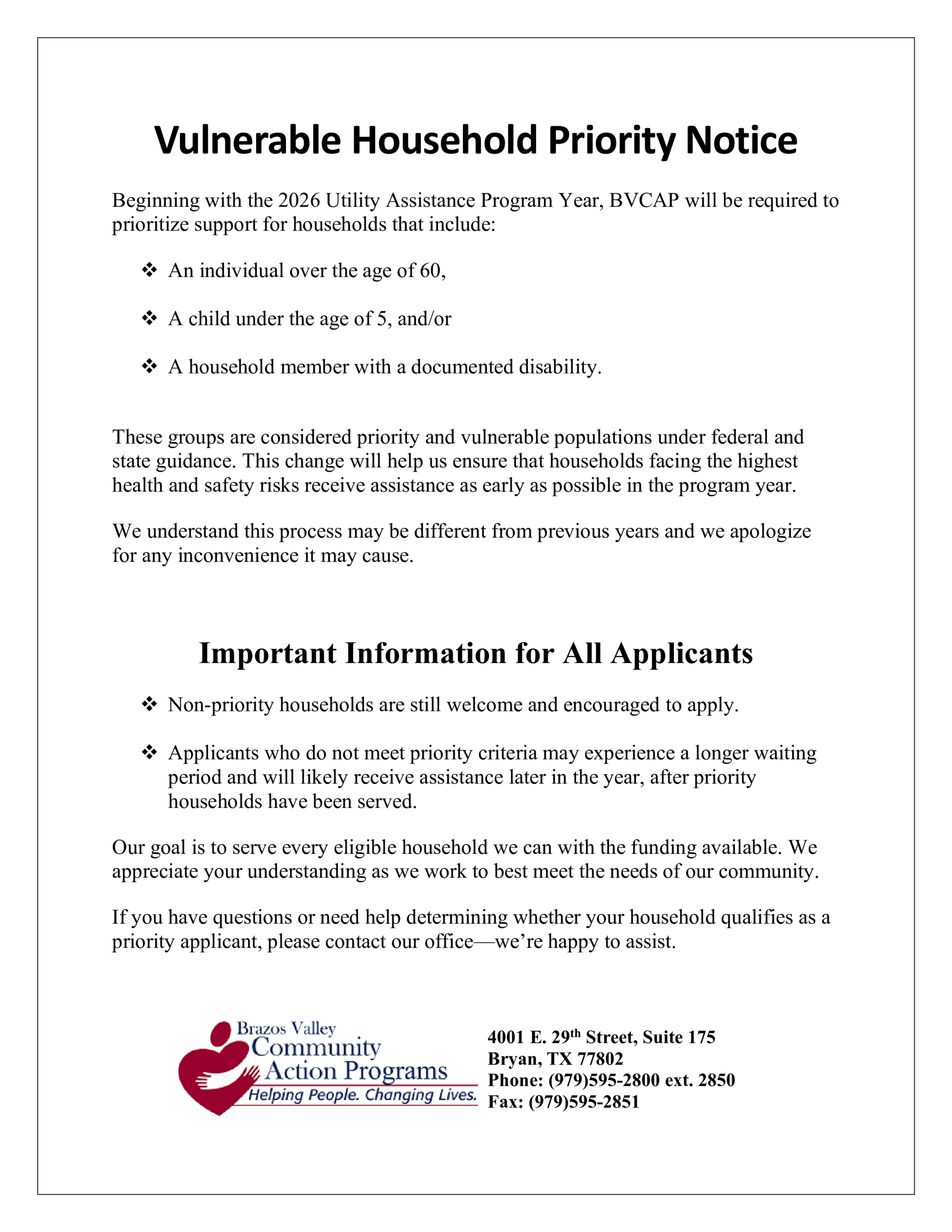 Recently issued executive orders have raised concerns about potential impacts on federal funding for programs that provide direct assistance to our clients. We understand the uncertainty this may cause and want to assure you that our local BVCAP staff are closely monitoring the situation.